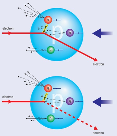 طرح فرضی از تفرق الکترونها در نتیجه عبور از درون پروتون و برخورد با کوارکها